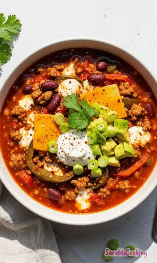 - Toppings: Cilantro, green onions, avocado, and Greek yogurt for a fresh, cool contrast to the rich and spicy chili.