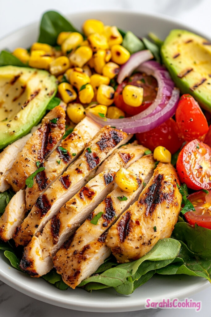 Add sliced chicken, grilled corn, tomatoes, red onion, and avocado. Drizzle with vinaigrette just before serving for best texture.