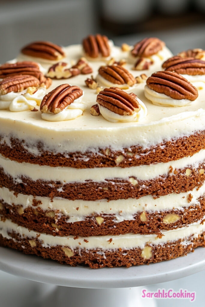 • Toasting the pecans for the garnish separately from the ones in the cake ensures they stay crunchy and visually distinct on top.
